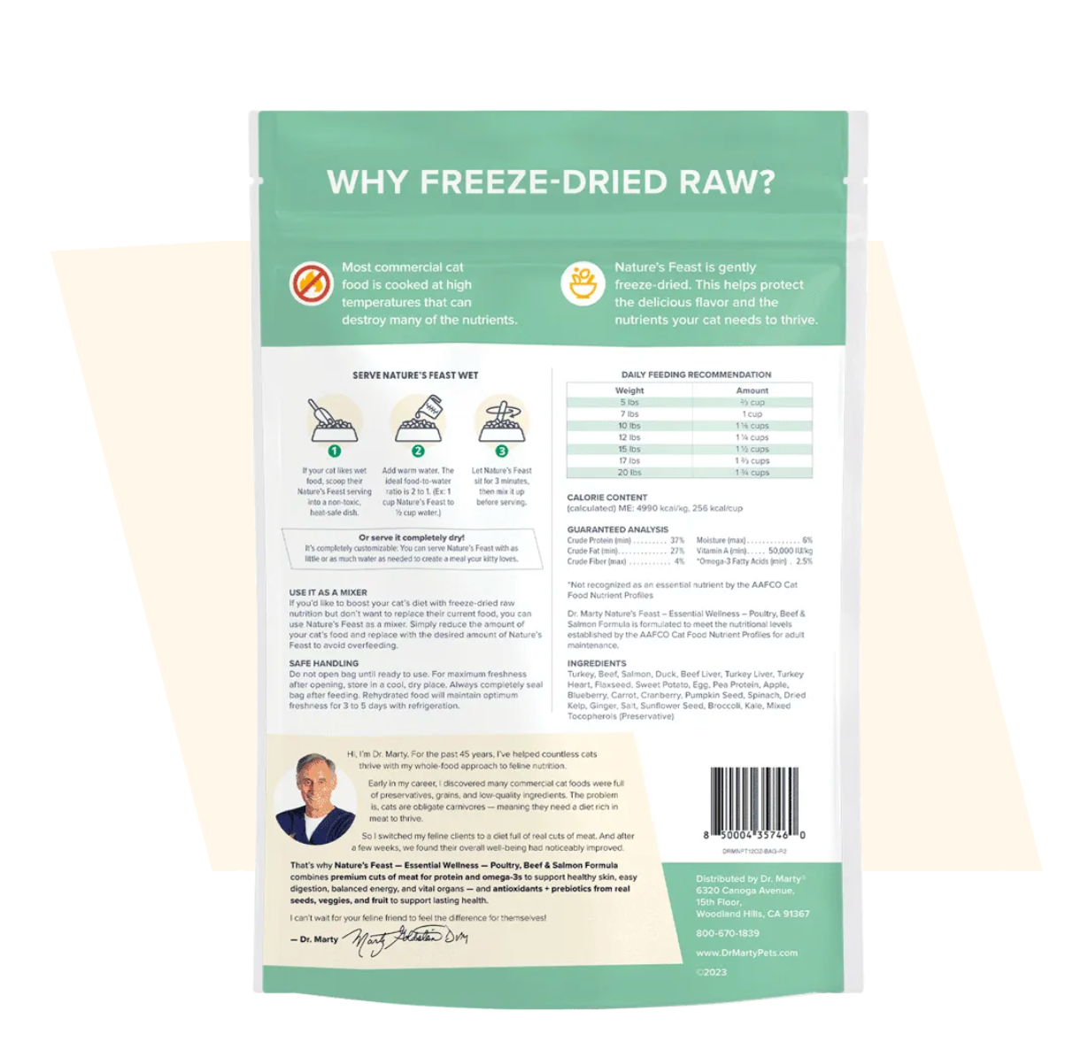 Dr. Marty Nature’s Feast – Essential Wellness – Poultry, Beef, & Salmon — premium freeze-dried raw food designed to help your cat thrive. Made with real cuts of protein-rich poultry, beef, and salmon, plus antioxidant-rich vegetables, fruits, and seeds, this wholesome blend delivers complete nutrition without any artificial preservatives, fillers, or hidden junk ingredients.