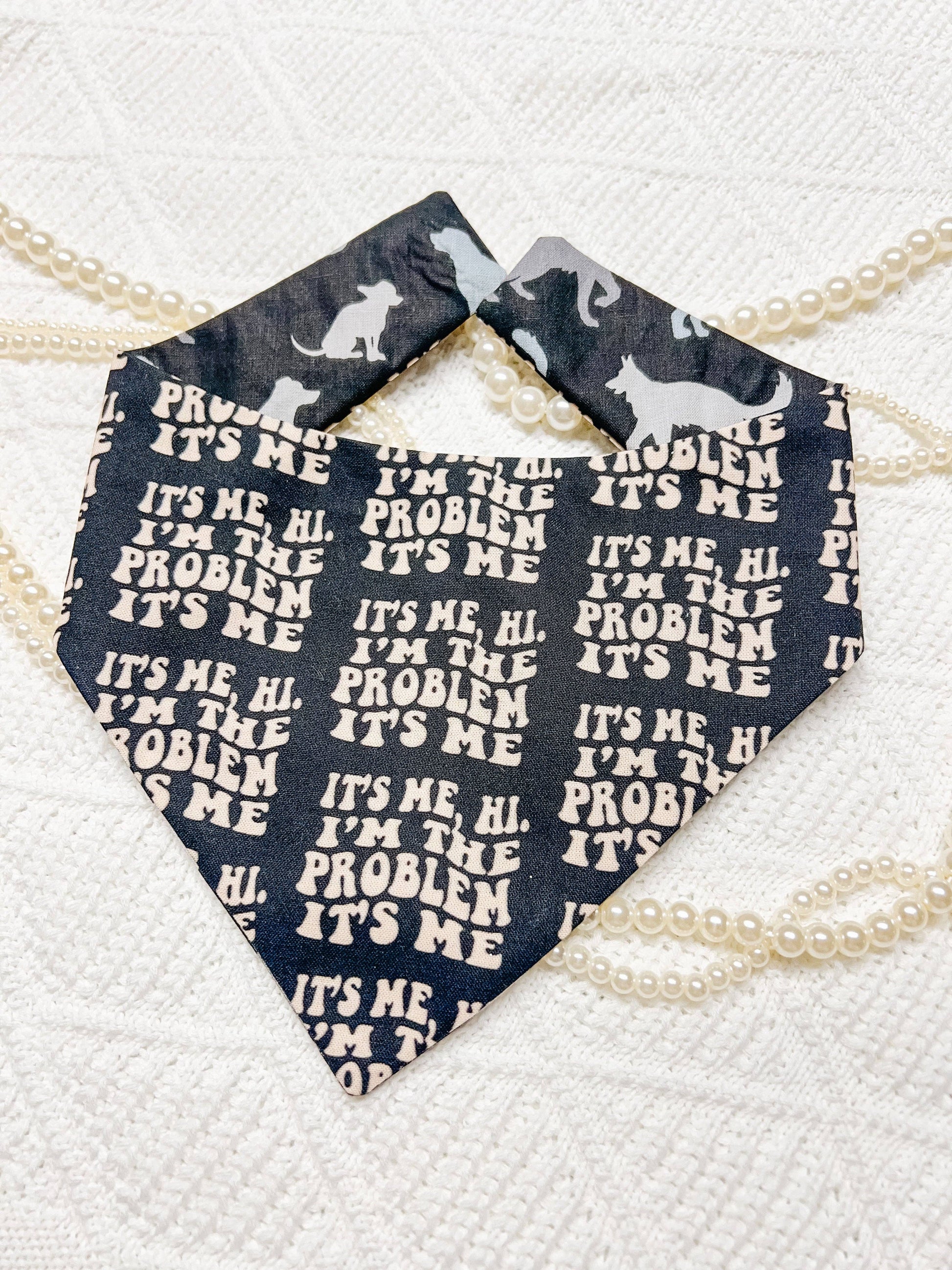 Let your pup embrace their main character energy with our Hi I’m The Problem Reversible Dog Bandana, inspired by Taylor Swift’s iconic Anti-Hero. Perfect for summer days, this playful bandana brings a pop of color, comfort, and personality to your dog’s look.