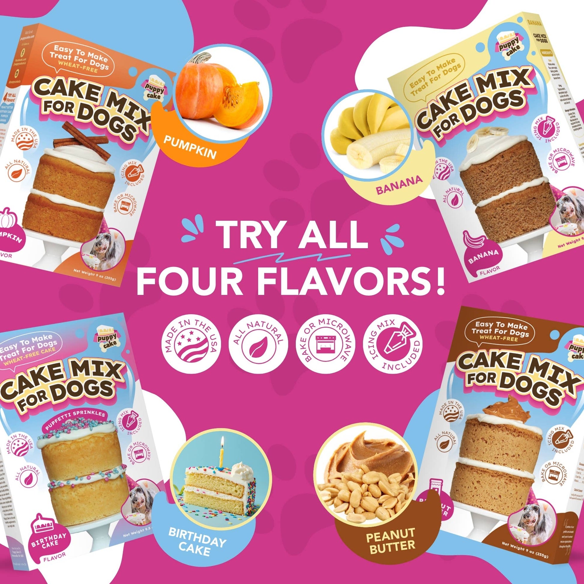 Make your pup’s birthday or special occasion unforgettable with Puppy Cake Dog Birthday Cake Mix! Available in a delightful range of flavors—including Birthday Cake, Peanut Butter, Red Velvet, Carob, Pumpkin, and Banana—each mix is carefully crafted to delight your dog’s taste buds.
